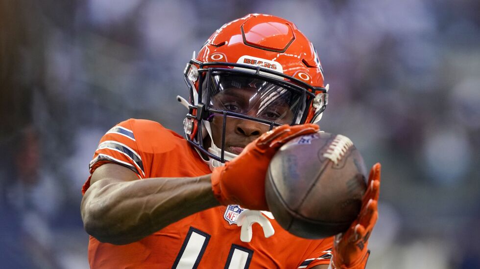 Bears receiver Darnell Mooney left early in the third quarter against the Jets and is unlikely to return. (Nam Y. Huh/AP)