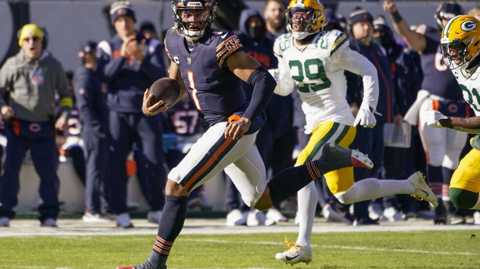 Justin Fields, whose rise has pumped electricity into an otherwise listless season, leads all NFL quarterbacks with 905 rushing yards. Two spots behind him is his upcoming foe, the Eagles’ Jalen Hurts, at 686.