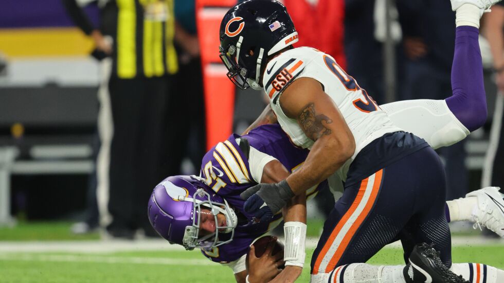 Sweat’s presence has allowed the Bears to be more creative — not only creating advantageous matchups, but also giving looks the offense hasn’t seen. Against the Vikings, defensive line coach Travis Smith used ends Sweat and Yannick Ngakoue on the left side of the line, creating a one-on-one opportunity that Sweat parlayed into a sack of Joshua Dobbs.