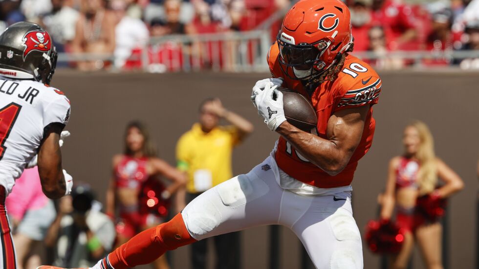 He has 51 yards and a touchdown on four catches out of 14 targets from Fields going into the game against the Broncos on Sunday. Fields threw to him four times in the blowout loss to the Chiefs last week, and Claypool had one catch for 15 yards — on the Bears’ first play.