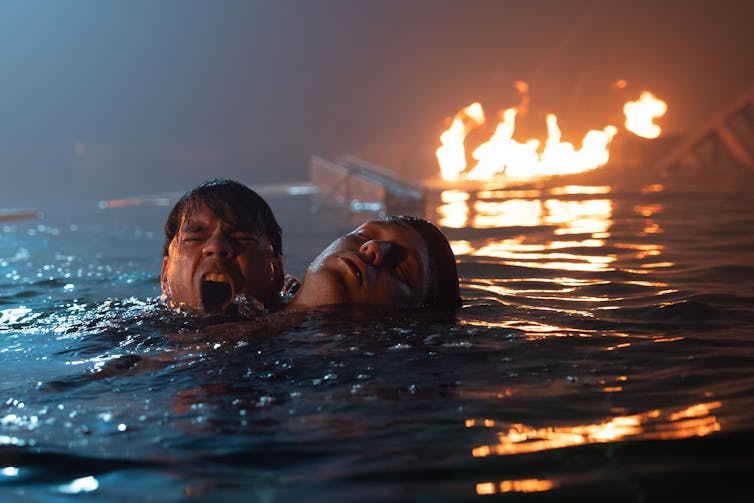 Beast of War follows suit by blending second world war aesthetics and shark survival gore. It’s also a very Australian film. Alongside themes of mateship and racism experienced by Indigenous soldiers is over-the-top Aussie slang. In one comical line, Des points a puny rifle at the enormous shark surging towards them and yells: “Come on you toothy bastard!”