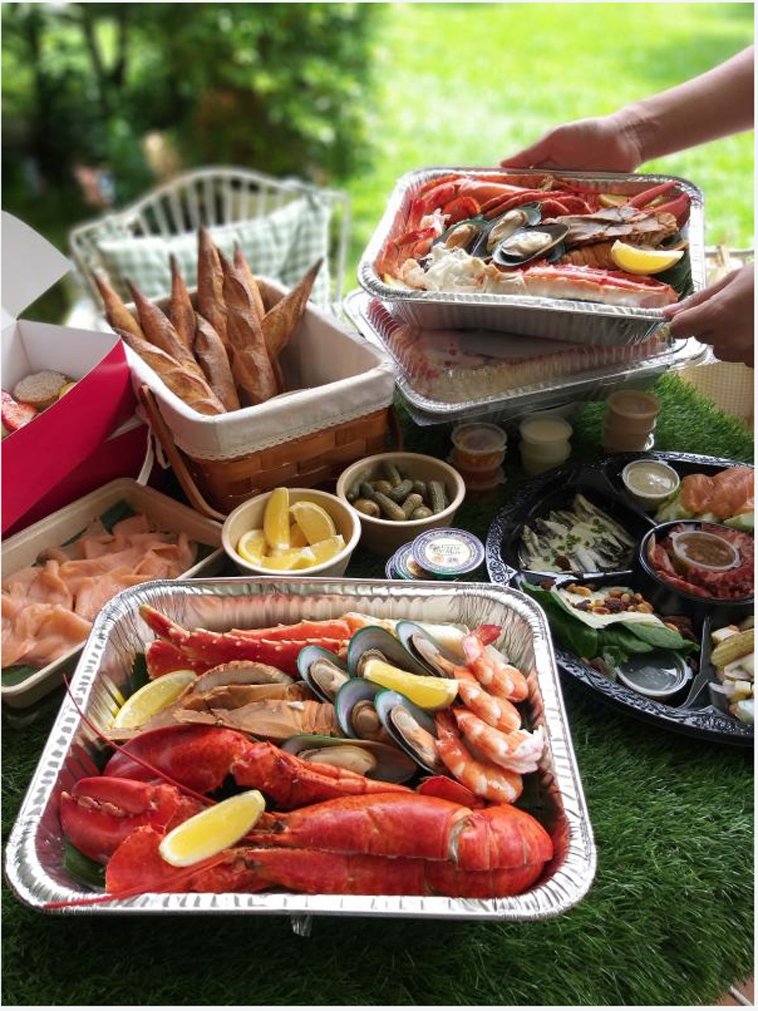 Each package comes with a repertoire of seafood on ice that includes one whole Canadian lobster per person; Alaskan king crab; black tiger prawns; slipper lobsters; New Zealand mussels; and smoked salmon, plus three kinds of dipping sauces.