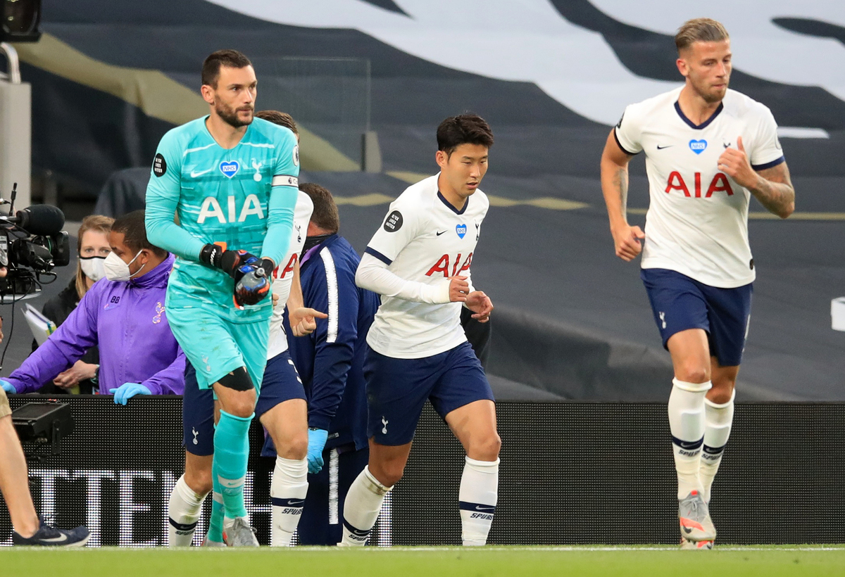 Premier League - Tottenham Hotspur v Everton - Tottenham Hotspur Stadium, London, Britain - July 6, 2020 Tottenham Hotspur's Son Heung-min and Hugo Lloris come out for the second half, as play resumes behind closed doors following the outbreak of the coronavirus disease (COVID-19) Adam Davy/Pool via REUTERS