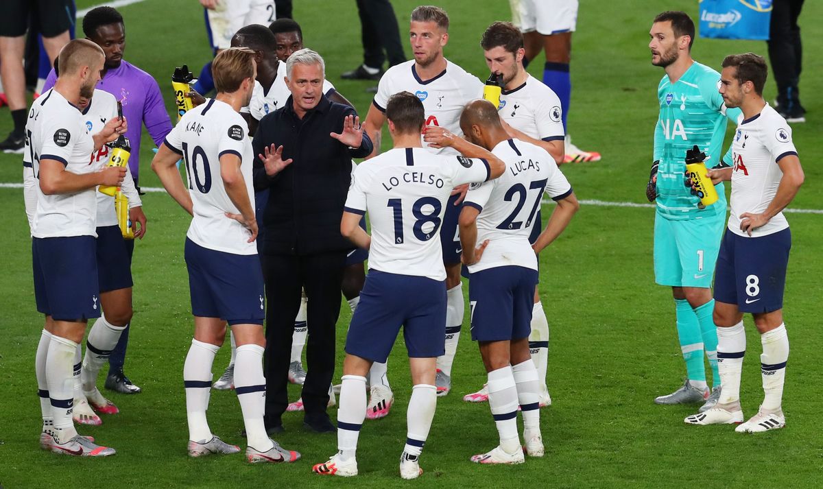 Premier League - Tottenham Hotspur v Everton - Tottenham Hotspur Stadium, London, Britain - July 6, 2020 Tottenham Hotspur's Hugo Lloris celebrates with Son Heung-min and Lucas Moura after the match, as play resumes behind closed doors following the outbreak of the coronavirus disease (COVID-19) Adam Davy/Pool via REUTERS Premier League - Tottenham Hotspur v Everton - Tottenham Hotspur Stadium, London, Britain - July 6, 2020 Tottenham Hotspur manager Jose Mourinho talks to his players during a drinks break, as play resumes behind closed doors following the outbreak of the coronavirus disease (COVID-19) Catherine Ivill/Pool via REUTERS