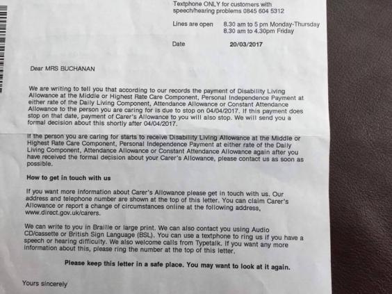 Three days later, Ms Buchanan received another letter from the DWP saying her husband's Attendance Allowance, designed to help with personal care for disabled people aged 65 or over, would also be stopping.