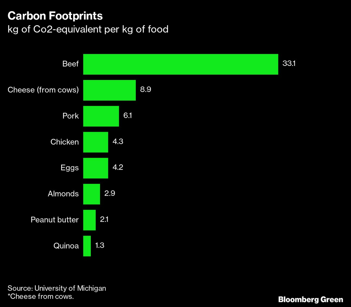 Mainstream climate science has long presented a much more grim arithmetic. Cows burp out large quantities of heat-trapping methane. As a result, beef causes vastly more emissions than most other foods—more than five times as much as an equivalent amount of chicken or pork and at least 15 times more than lentils and other plant-based proteins, according to data from the University of Michigan.