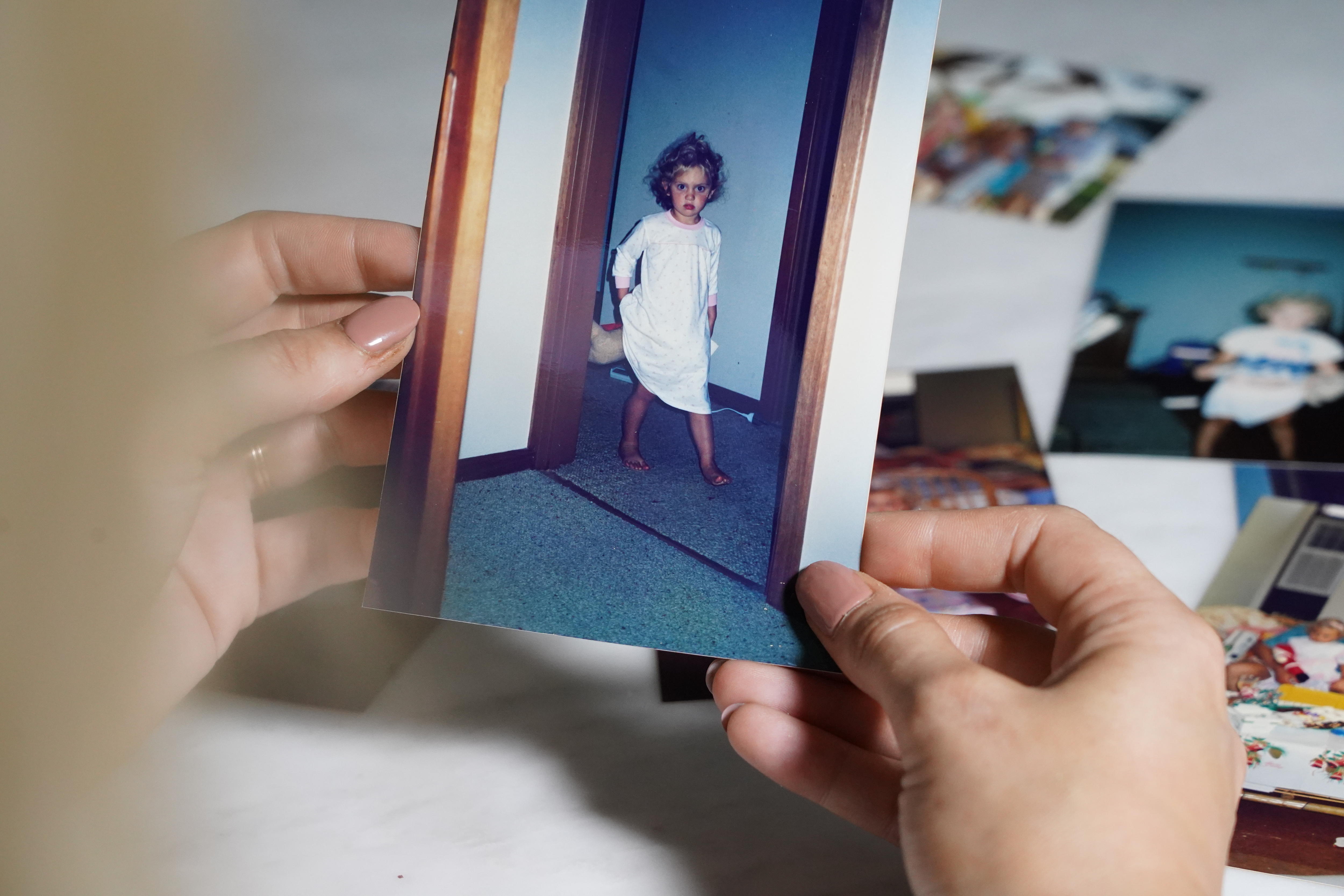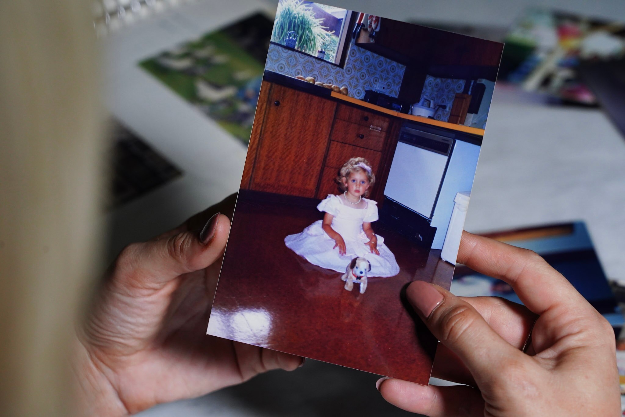 Alysha holds a faded photograph of a four-year-old girl wearing a frilly pink dress and a pink bow in her hair, staring blankly at the camera.