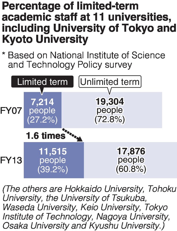 The number of academic staff at universities and researchers with limited terms is growing. According to a National Institute of Science and Technology Policy survey, at 11 top universities, including the University of Tokyo and Kyoto University, the number of limited-term academic staff grew from slightly under 30 percent of the overall number in fiscal 2007 to nearly 40 percent in fiscal 2013.
