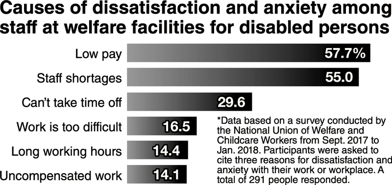 According to a Health, Labor and Welfare Ministry survey, nursing care staff at welfare facilities earn about 220,000 yen per month. This is about 90,000 yen lower than the average for all industries. In a survey conducted from September 2017 to January 2018 by the National Union of Welfare and Childcare Workers, which represents nursery teachers, nursing care staff and other professionals, over half of respondents cited "low pay" and "staff shortages" as reasons for dissatisfaction and anxiety. Notable comments include, "Although we're responsible for people's lives, that's not reflected in our salaries" and "The staff is too shorthanded to provide attentive support."