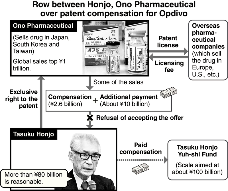 Meanwhile, the compensation offered by Ono for the use of the patent held by Honjo is about 2.6 billion yen. The Osaka-based company offered to pay an additional royalty, which is said to have been about 10 billion yen, but Honjo's side has argued that a fair figure should be more than 80 billion yen and has refused Ono Pharmaceutical's offer.