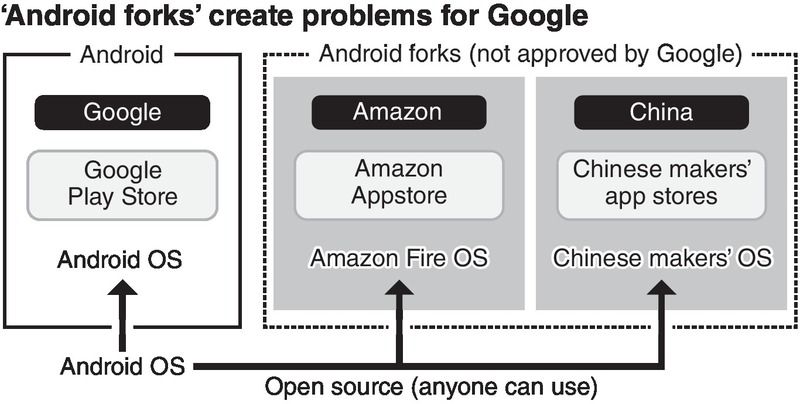 Another point judged illegal by the European Commission was Google's prohibiting manufacturers of Android handsets from selling handsets using Android forks. Google, unable to ignore Android forks, had taken forceful measures.