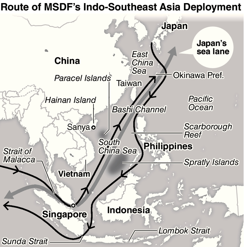 The MSDF's Cort Flotilla 4 Commander Tatsuya Fukuda, 51, who oversaw the deployment, said: "There is a difference in the level of tension between the East China Sea and the South China Sea. In the East China Sea [the site of conflict over the Senkaku Islands], China is more aggressive, while in the South China Sea, it is gentlemanly. We're aware China is also starting to take actions that have a legal basis."