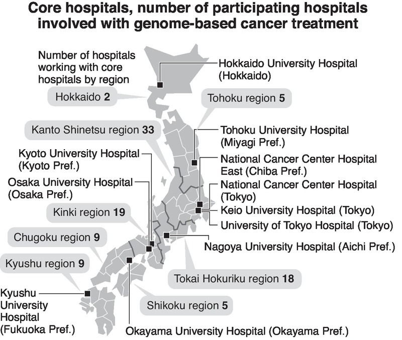 At a press conference in March, a Health, Labor and Welfare Ministry official in charge of this issue explained the future objectives of the treatment. "We want to establish a system through which patients can receive genome-based cancer treatment in every prefecture across the nation," the official said. In February, the ministry designated 11 core hospitals that will lead the way in genome-based treatment. On the day of the press conference, it announced the names of 100 hospitals that will participate in the program.