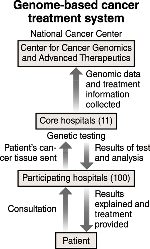 Genome-based cancer treatment (see below) involves examining gene mutations that can cause cancer and exploring the best methods for treating the disease. This spring, the government announced the names of 100 hospitals that will work closely with 11 "core hospitals" to provide cancer treatment based on genome information. The government aims to have the treatment covered by health insurance from April 2019. The National Cancer Center Hospital will expand its clinical research accordingly. However, a number of challenges exist. Genome tests are expensive, and effective drugs for cancer treatment are found in only about 10 percent of cases using the tests.