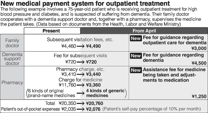 The Health, Labor and Welfare Ministry released preliminary calculations showing that, even if family doctors had their remuneration increased in cooperation with dementia-support doctors, the burden on patients could be kept from greatly increasing by reducing overmedication and switching to cheaper generic drugs.