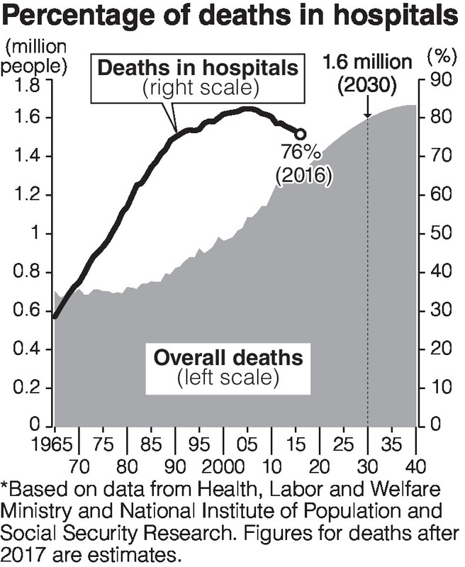 With the continued aging of Japan's population, the Health, Labor and Welfare Ministry estimates that by the year 2025, there will be about 1 million people receiving at-home medical care services, or about 1.5 times more than the 2014 figure of about 650,000. The number of deaths per year will reach about 1.6 million by 2030, heralding the arrival of a so-called "high-death society."
