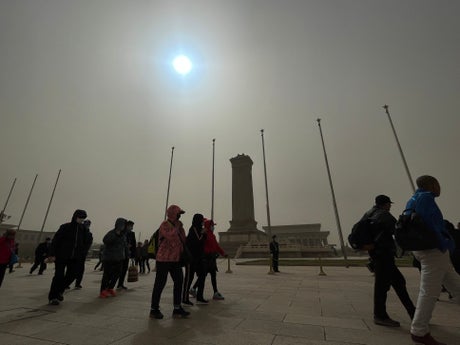The unusual weather in the Chinese capital is due to winds from drought-hit Mongolia and northwestern China.