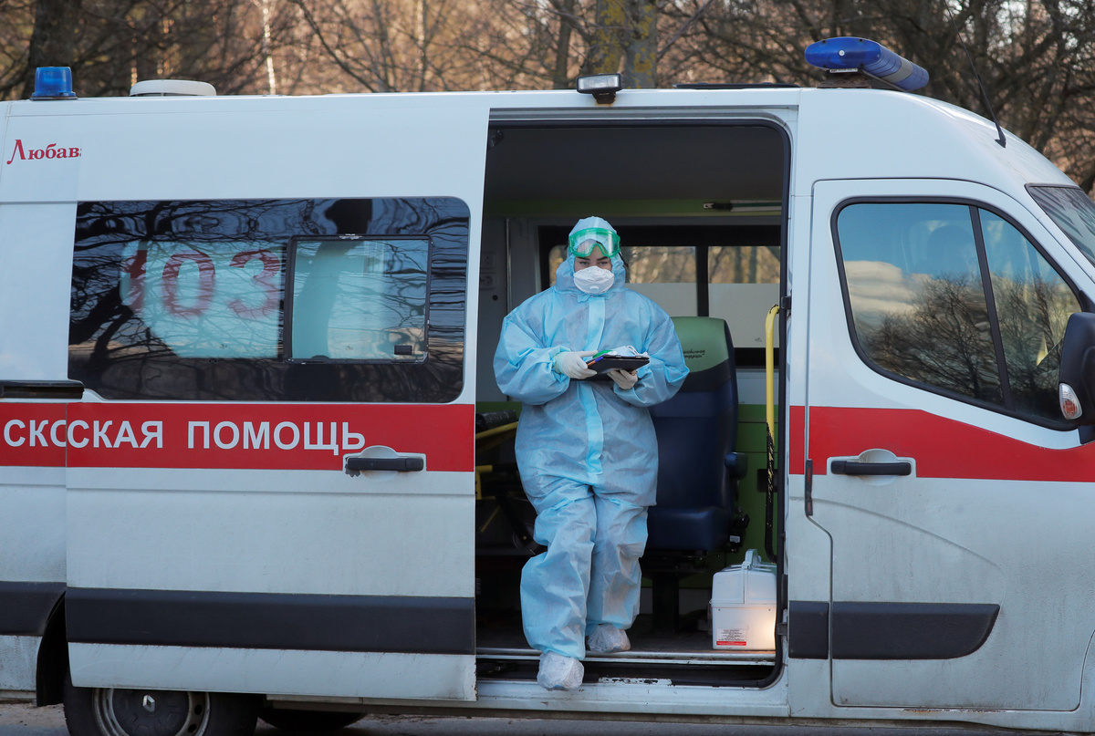 A medical staff member wearing a protective suit gets out of an ambulance near a dormitory in Minsk, Belarus March 13, 2020. REUTERS/Vasily Fedosenko