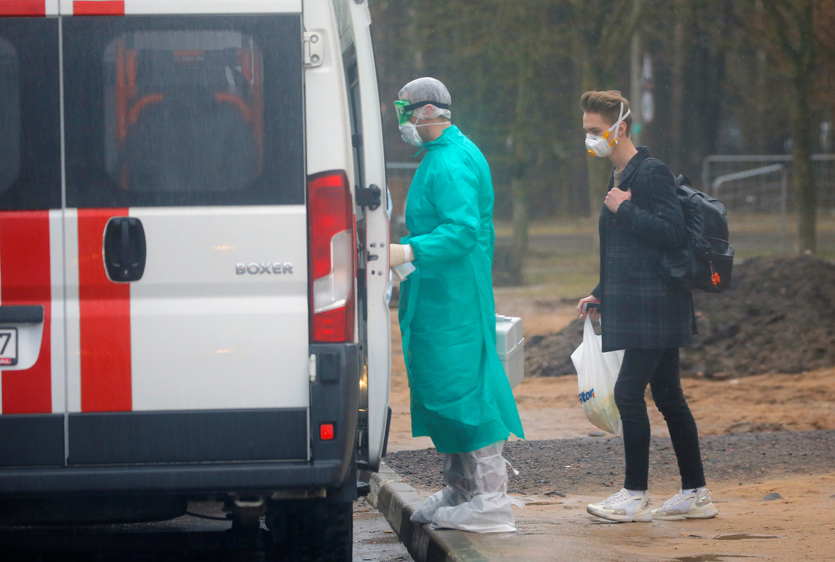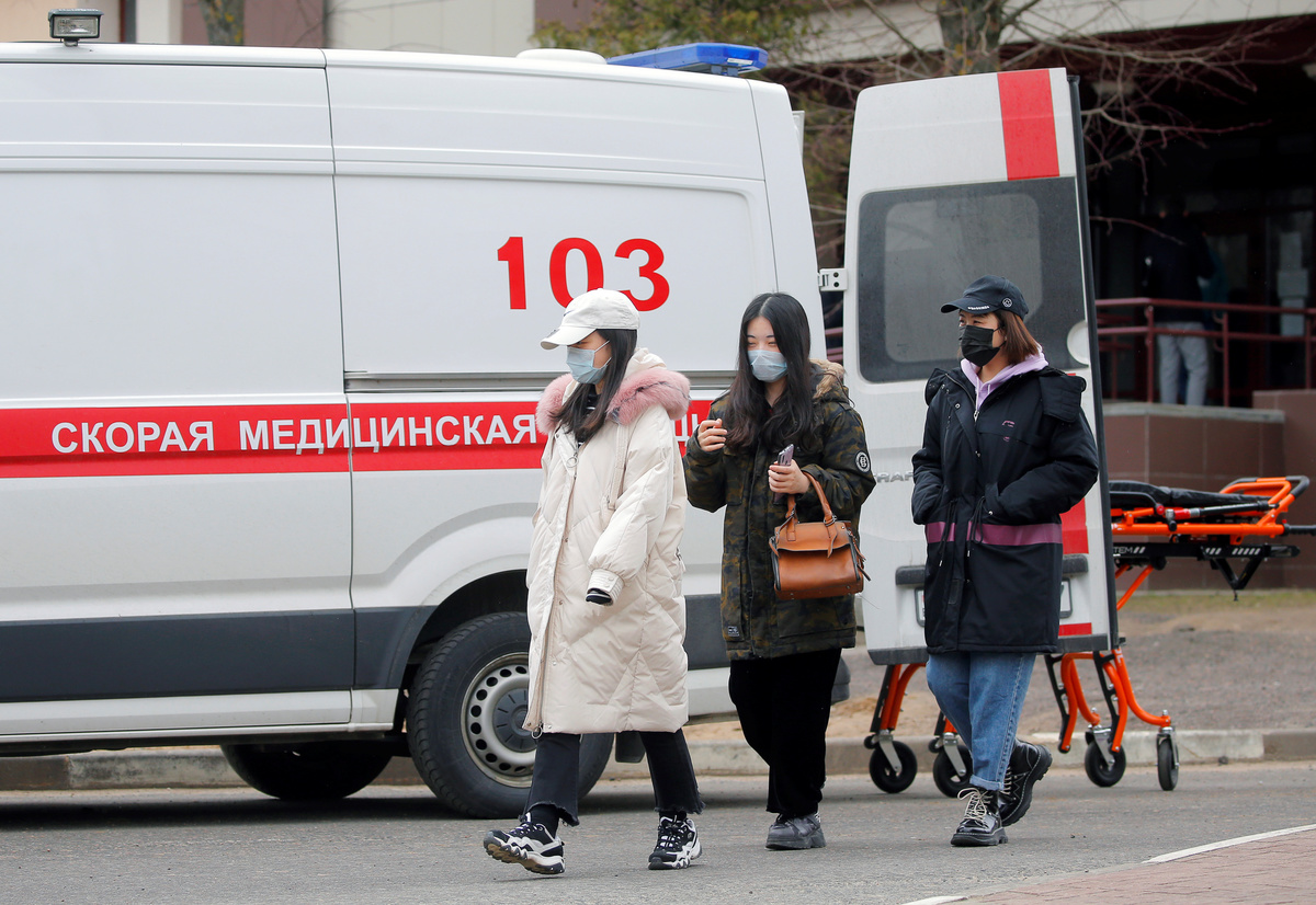 FILE PHOTO: Students wear protective masks as they walk past an ambulance car near a dormitory in Minsk, Belarus March 12, 2020. REUTERS/Vasily Fedosenko