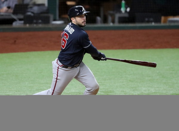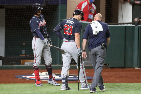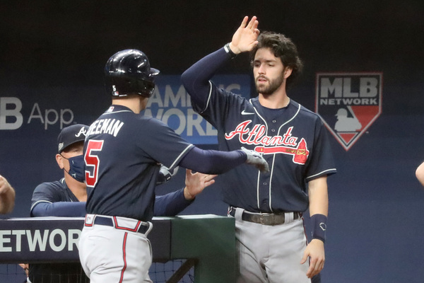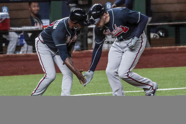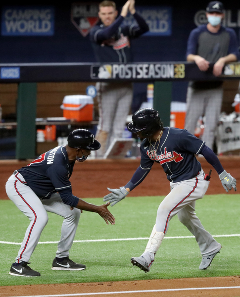 Atlanta Braves first baseman Freddie Freeman (5) low fives with third base coach Ron Washington on a first inning homer in game one of the NLCS at Globe Life Field Monday, Oct. 12, 2020 in Arlington, Texas. (Robert Gauthier/Los Angeles Times/TNS)