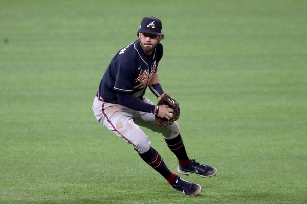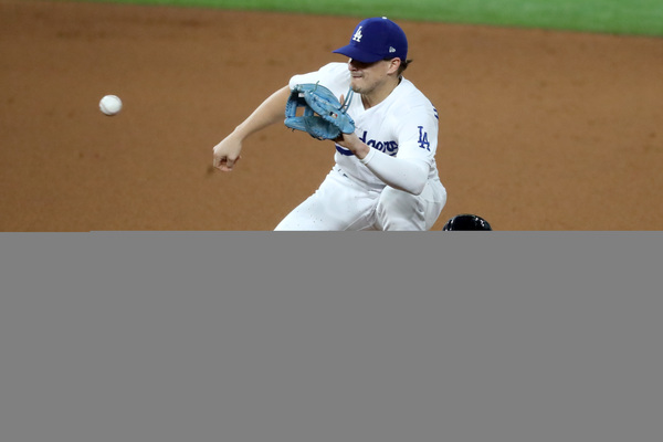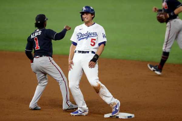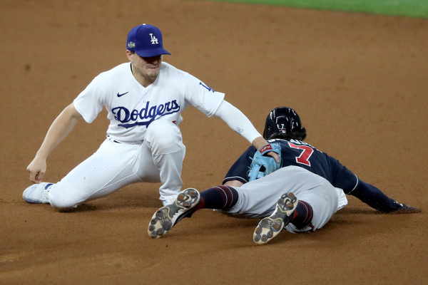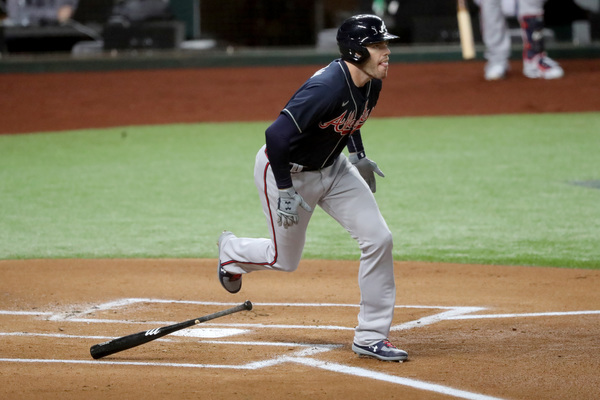 Atlanta Braves first baseman Freddie Freeman, left, is out at first base on a ground ball fielded by Los Angeles Dodgers first baseman Max Muncy during the fifth inning in Game 1 Monday, Oct. 12, 2020, for the best-of-seven National League Championship Series at Globe Life Field in Arlington, Texas. Also shown on the play is Atlanta Braves first base coach DeMarlo Hale (58). (Curtis Compton/Atlanta Journal-Constitution/TNS)