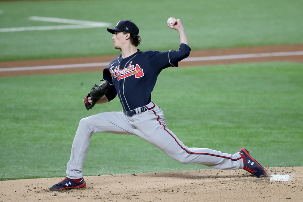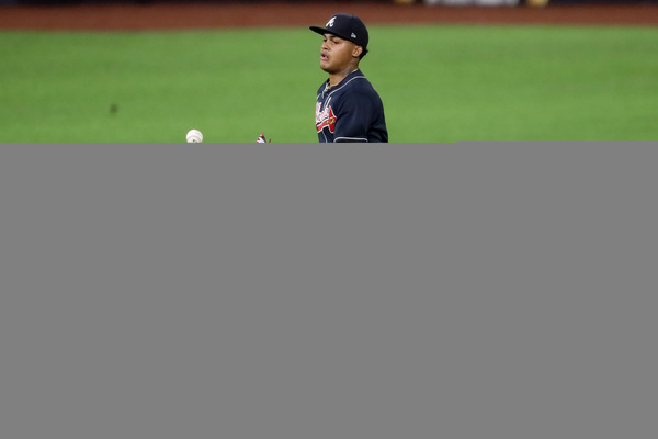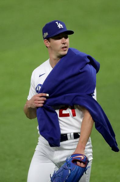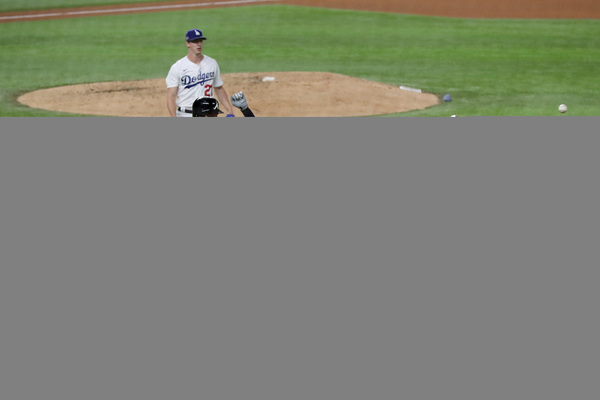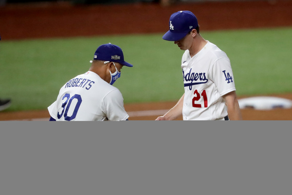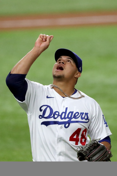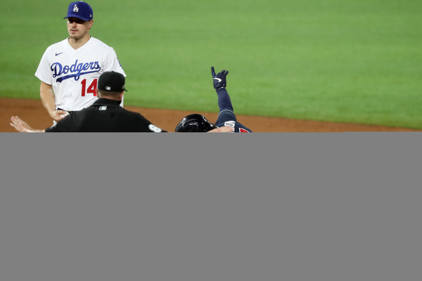 Los Angeles Dodgers starting pitcher Brusdar Graterol reacts after getting Atlanta Braves right fielder Nick Markakis (not pictured) to ground out with runners in scoring position to end the top of the sixth inning in Game 1, Monday, Oct. 12, 2020, for the best-of-seven National League Championship Series at Globe Life Field in Arlington, Texas. (Curtis Compton/Atlanta Journal-Constitution/TNS)