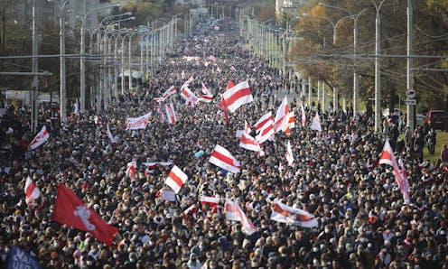 The demonstrators carried the red-and-white national flag, outlawed by a referendum held by Lukashenko in 1995, and adopted peaceful tactics. Most had voted for Sviatlana Tsikhanouskaya, a 38-year-old English teacher now living in exile in Lithuania.