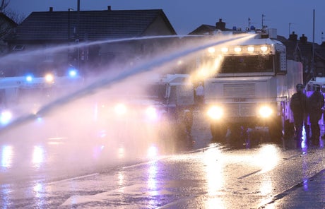 Rioters have been blasted with a water cannon by police amid fresh clashes in west Belfast as the White House said it was “concerned” at several days of disorder.