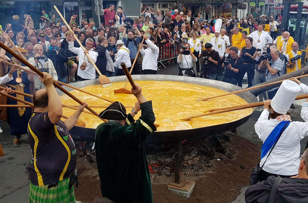 Under a timid Belgian sun and with music playing they tucked into the giant omelet cooked over an open fire by "The World Fraternity of Knights of the Giant Omelette", which was created in 1973.