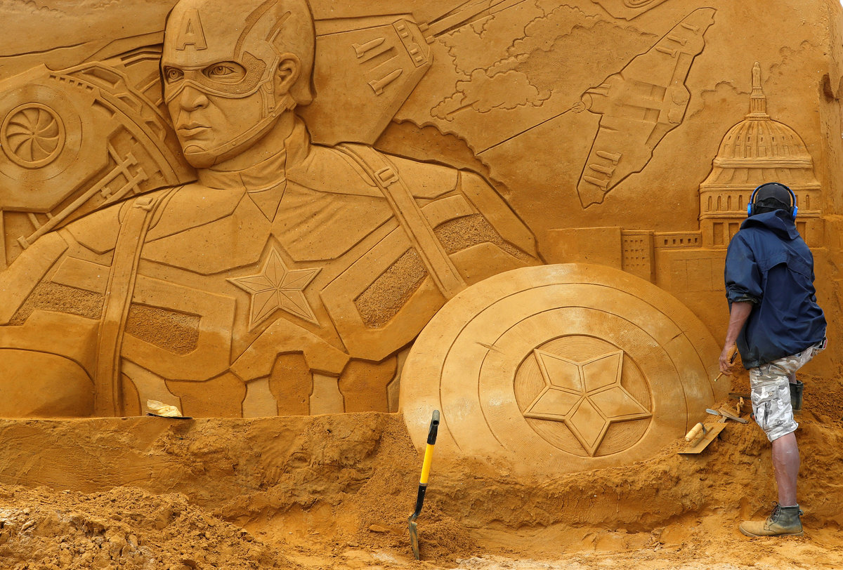 OSTEND, Belgium (Reuters) - On a Belgium beach, an artist adds the final touches to an imposing sand sculpture of the Incredible Hulk and his bristling muscles ahead of the opening of the world's biggest festival of its kind.
