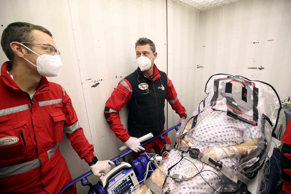 The helicopter operator transports each COVID sufferer inside a giant transparent plastic bag connected to medical devices. Most of the transferred patients are intubated and on ventilators.