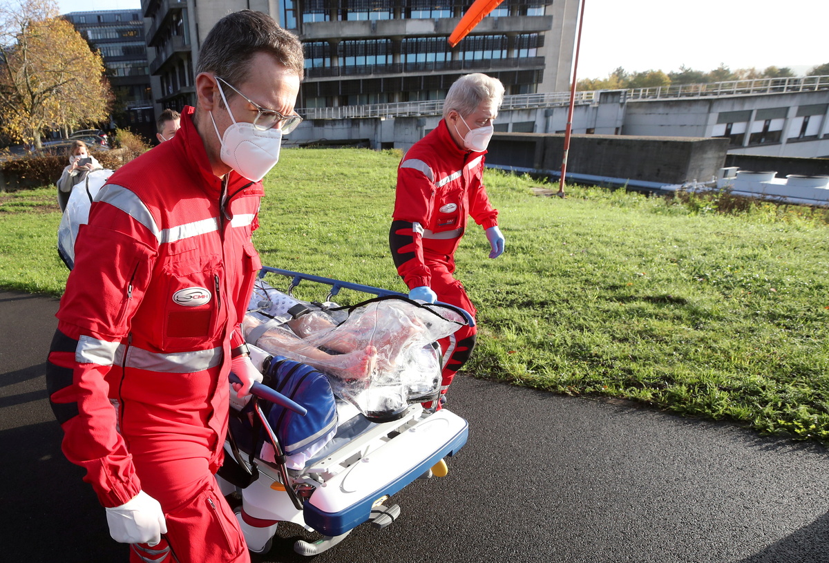 A trip such as to the German city of Muenster would take at least three hours by road, but can be done up to three times faster by air, and with fewer shocks to the patient such as from road bumps.