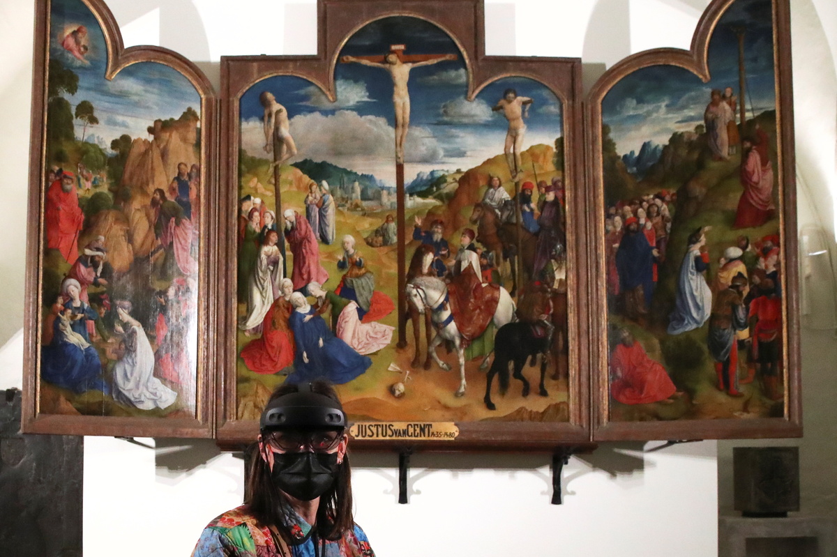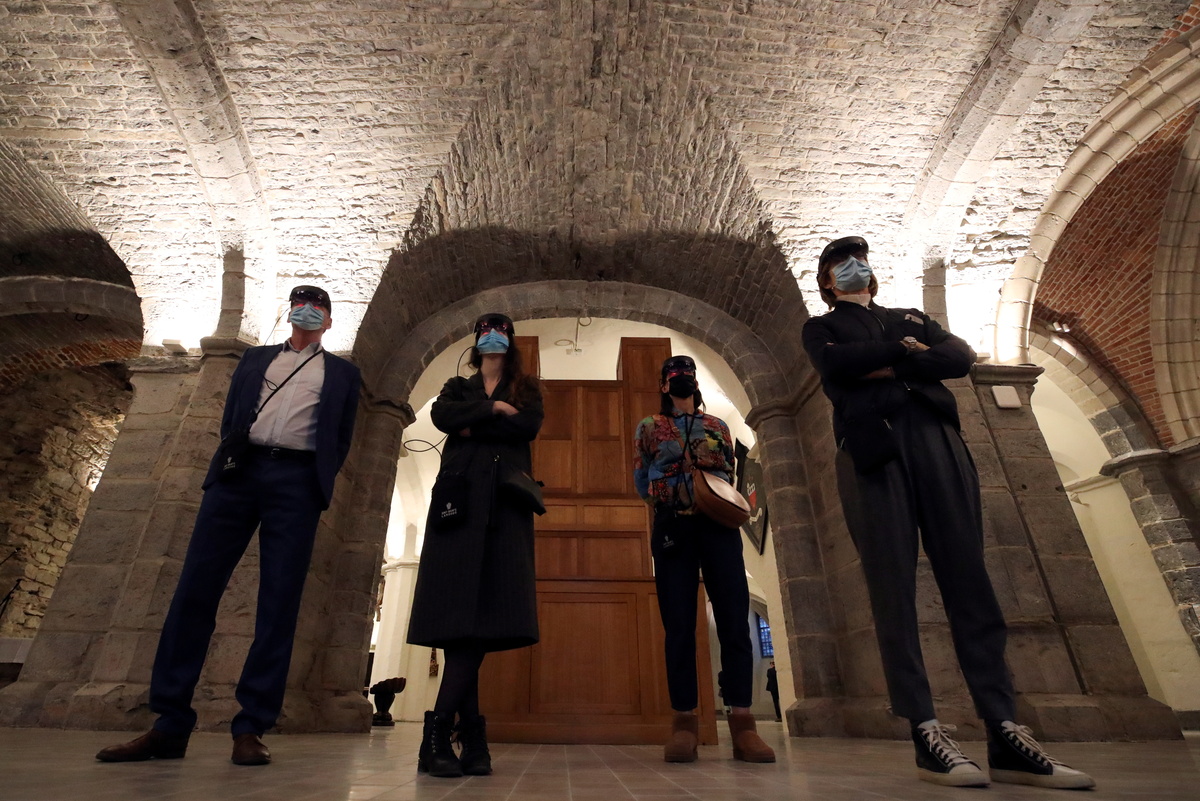 A visitor wears virtual glasses during a visit at St Bavo's Cathedral where Flemish painter Jan Van Eyck's 15th century masterpiece "Ghent Altarpiece" is displayed in a new multi-million euro exhibition space, equipped AI technology to plunge visitors into the painting, in Ghent, Belgium March 26, 2021. REUTERS/Yves HermanA visitor wears virtual glasses during a visit at St Bavo's Cathedral where Flemish painter Jan Van Eyck's 15th century masterpiece "Ghent Altarpiece" is displayed in a new multi-million euro exhibition space, equipped AI technology to plunge visitors into the painting, in Ghent, Belgium March 26, 2021. REUTERS/Yves HermanVisitors wear virtual glasses during a visit at St Bavo's Cathedral where Flemish painter Jan Van Eyck's 15th century masterpiece "Ghent Altarpiece" is displayed in a new multi-million euro exhibition space, equipped AI technology to plunge visitors into the painting, in Ghen, Belgium March 26, 2021. REUTERS/Yves Herman