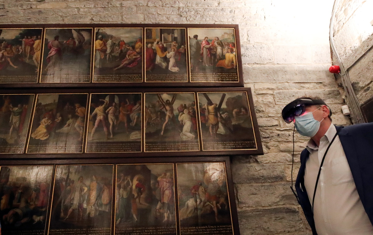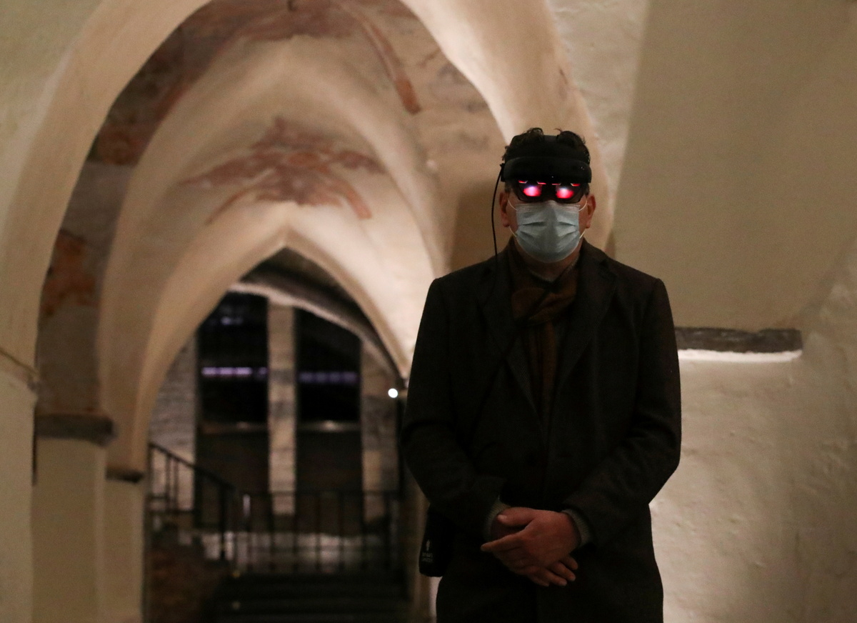 A visitor wears virtual glasses during a visit at St Bavo's Cathedral where Flemish painter Jan Van Eyck's 15th century masterpiece "Ghent Altarpiece" is displayed in a new multi-million euro exhibition space, equipped AI technology to plunge visitors into the painting, in Ghen, Belgium March 26, 2021. REUTERS/Yves Herman