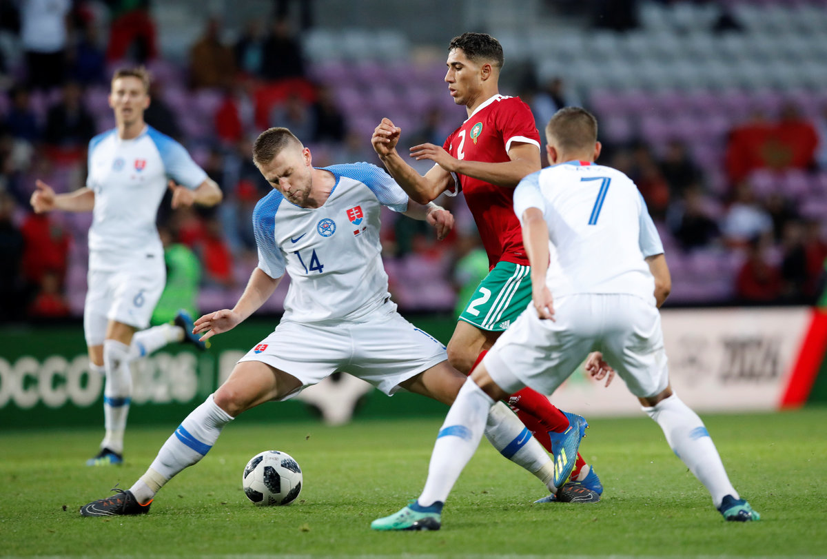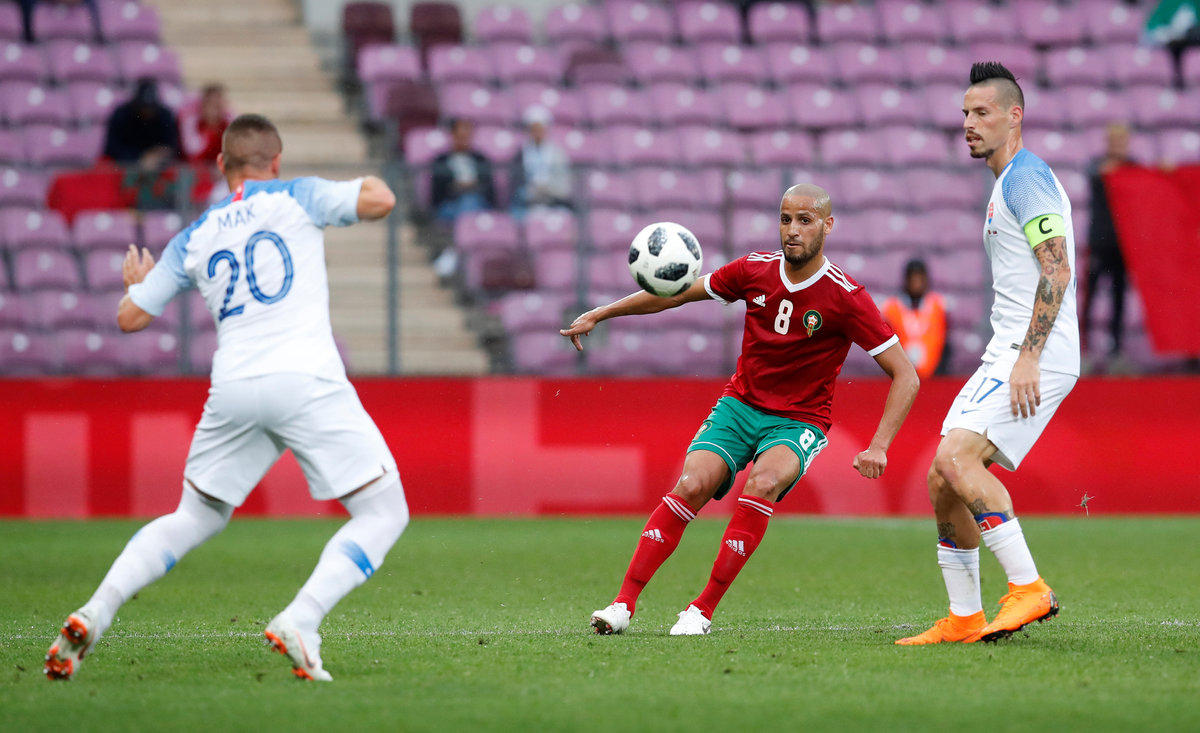 Soccer Football - International Friendly - Morocco vs Slovakia - Stade de Geneve, Geneva, Switzerland - June 4, 2018 Morocco’s Khalid Boutaib in action with Slovakia’s Milan Skriniar REUTERS/Denis BalibouseSoccer Football - International Friendly - Morocco vs Slovakia - Stade de Geneve, Geneva, Switzerland - June 4, 2018 Morocco’s Karim El Ahmadi in action REUTERS/Denis BalibouseSoccer Football - International Friendly - Morocco vs Slovakia - Stade de Geneve, Geneva, Switzerland - June 4, 2018 Morocco’s Khalid Boutaib in action with Slovakia’s Robert Mak REUTERS/Denis Balibouse