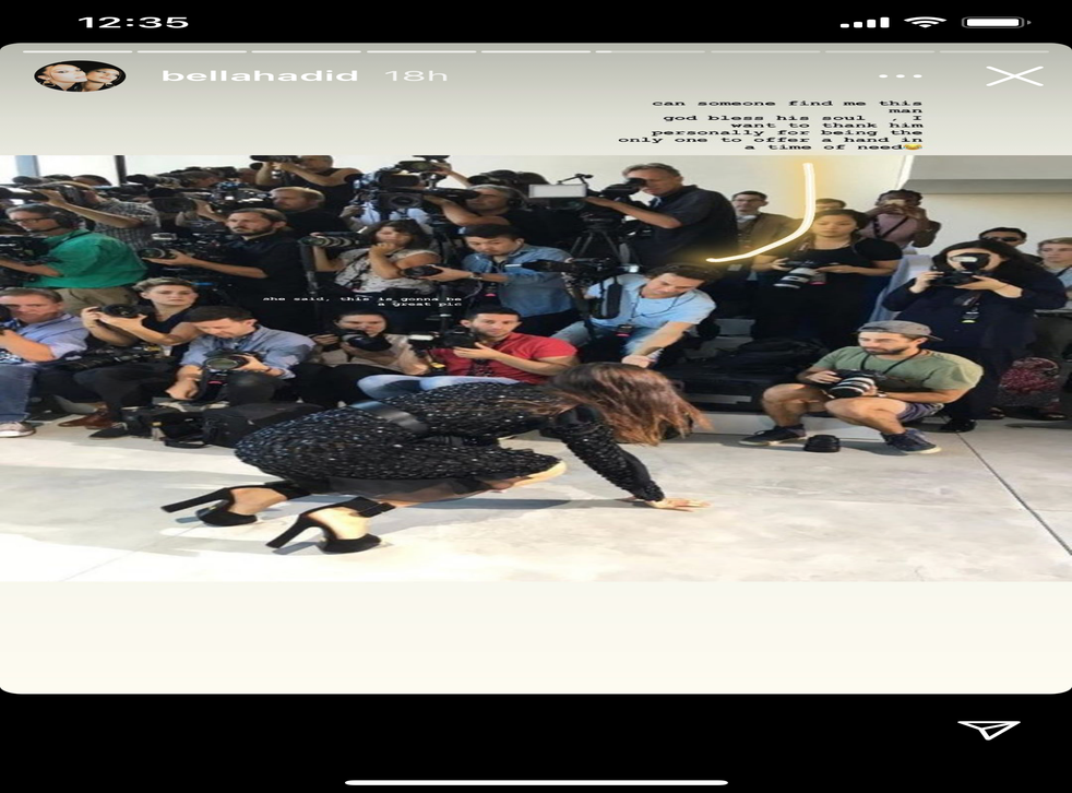 Bella Hadid has asked her Instagram followers for help finding a photographer who offered her a hand when she fell on the runway during New York Fashion Week.