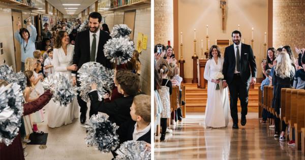 Following the heartfelt ceremony filled with beautiful vows and confessions of love, the newlyweds were surprised again. As they entered a school hallway, they were greeted by a line of students cheering them on with shiny pom-poms and spirited chants of 'L-O-V-E!'