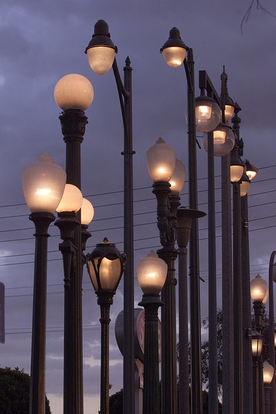 There were 25 of them, planted in a grassy median before a Staples office supply store, collectively representing seven decades of Los Angeles history, from 1925, when the city's Bureau of Street Lighting was established, through 1992, when parts of the neighborhood went up in flames during the Los Angeles riots. The streetlights, installed by artist Sheila Klein and a crew of volunteers in 1993 _ 15 years before Chris Burden erected "Urban Light" at the Los Angeles County Museum of Art _ were intended as a healing gesture in the wake of that uprising.