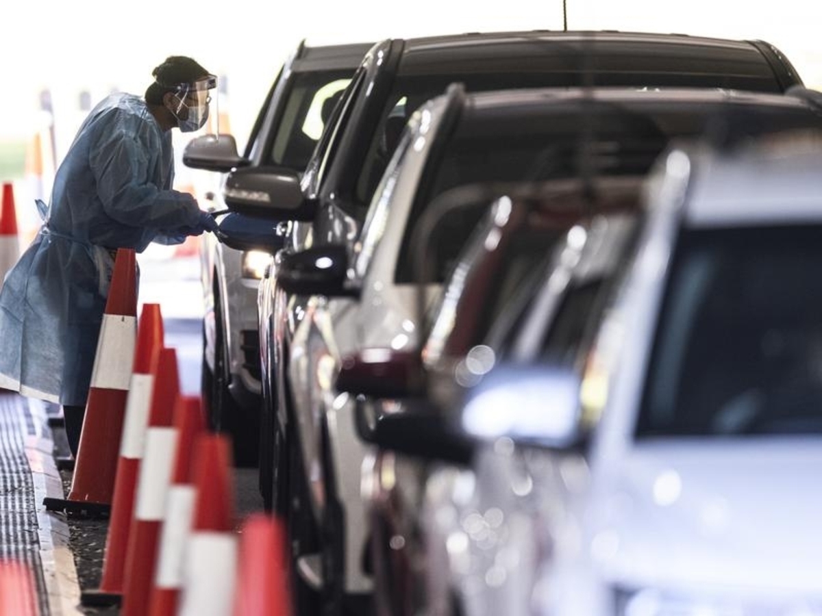 The man aged in his 50s suffered non-life threatening injuries when he was struck by a white Holden station wagon while helping people queue at the Collingwood CoHealth testing site on Tuesday morning.