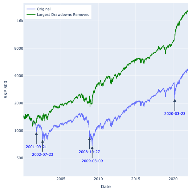 There have been five different 30-day 20% drawdowns in the S&P since January 2000. If a portfolio invested in the S&P missed all those drawdowns over that period it would have 4x the returns of one that stayed invested through all the drawdowns. That is the power of variance drag.