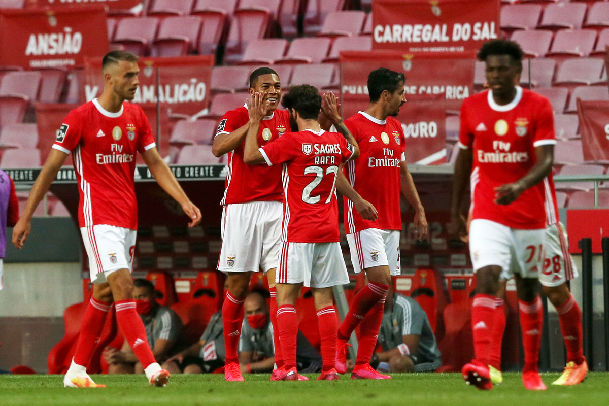 Soccer Football - Primeira Liga - Benfica v Santa Clara - Estadio da Luz, Lisbon, Portugal - June 23, 2020. Benfica's Carlos Vin’cius celebrates scoring their second goal with teammates, following the resumption of play behind closed doors after the outbreak of the coronavirus disease (COVID-19) Manuel De Almeida/Pool via REUTERS Soccer Football - Primeira Liga - Benfica v Santa Clara - Estadio da Luz, Lisbon, Portugal - June 23, 2020. Santa Clara's Anderson Carvalho celebrates scoring their first goal with teammates, following the resumption of play behind closed doors after the outbreak of the coronavirus disease (COVID-19) Manuel De Almeida/Pool via REUTERS Soccer Football - Primeira Liga - Benfica v Santa Clara - Estadio da Luz, Lisbon, Portugal - June 23, 2020. Santa Clara's Zaidu Sanusi celebrates scoring their second goal, following the resumption of play behind closed doors after the outbreak of the coronavirus disease (COVID-19) Manuel De Almeida/Pool via REUTERS Soccer Football - Primeira Liga - Benfica v Santa Clara - Estadio da Luz, Lisbon, Portugal - June 23, 2020. Santa Clara's Anderson Carvalho celebrates scoring their first goal with teammates, following the resumption of play behind closed doors after the outbreak of the coronavirus disease (COVID-19) Manuel De Almeida/Pool via REUTERS
