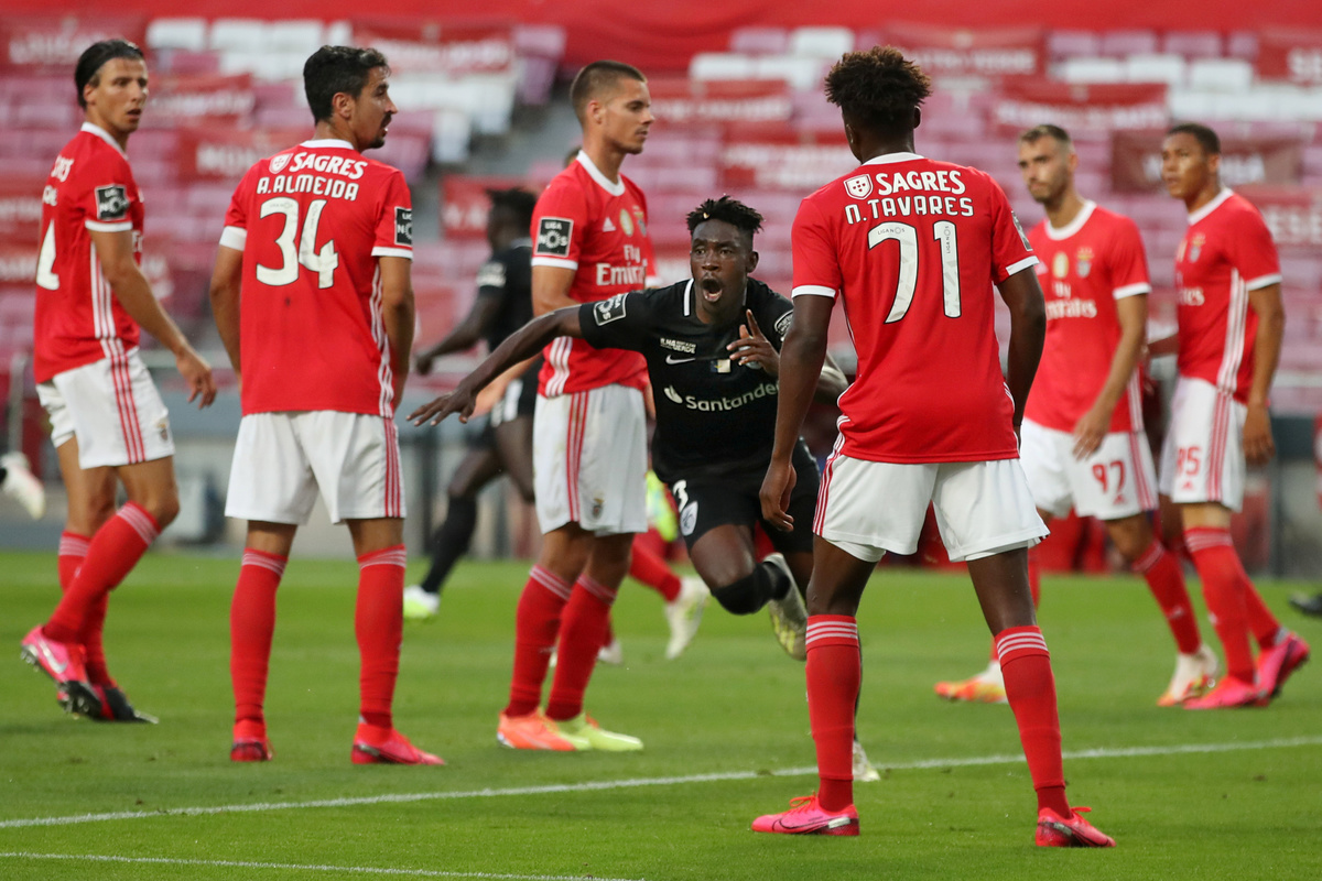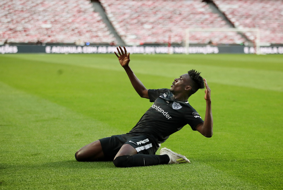 Soccer Football - Primeira Liga - Benfica v Santa Clara - Estadio da Luz, Lisbon, Portugal - June 23, 2020. Santa Clara's Zaidu Sanusi celebrates scoring their second goal, following the resumption of play behind closed doors after the outbreak of the coronavirus disease (COVID-19) Manuel De Almeida/Pool via REUTERS