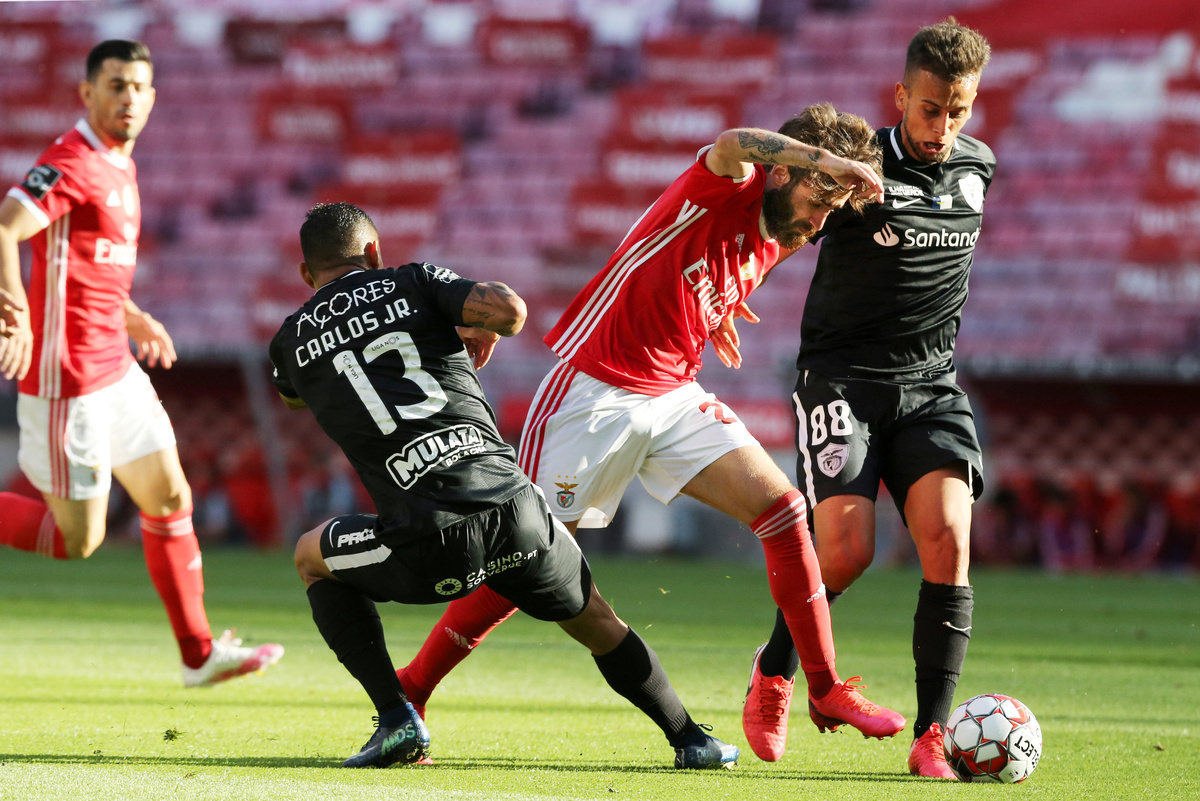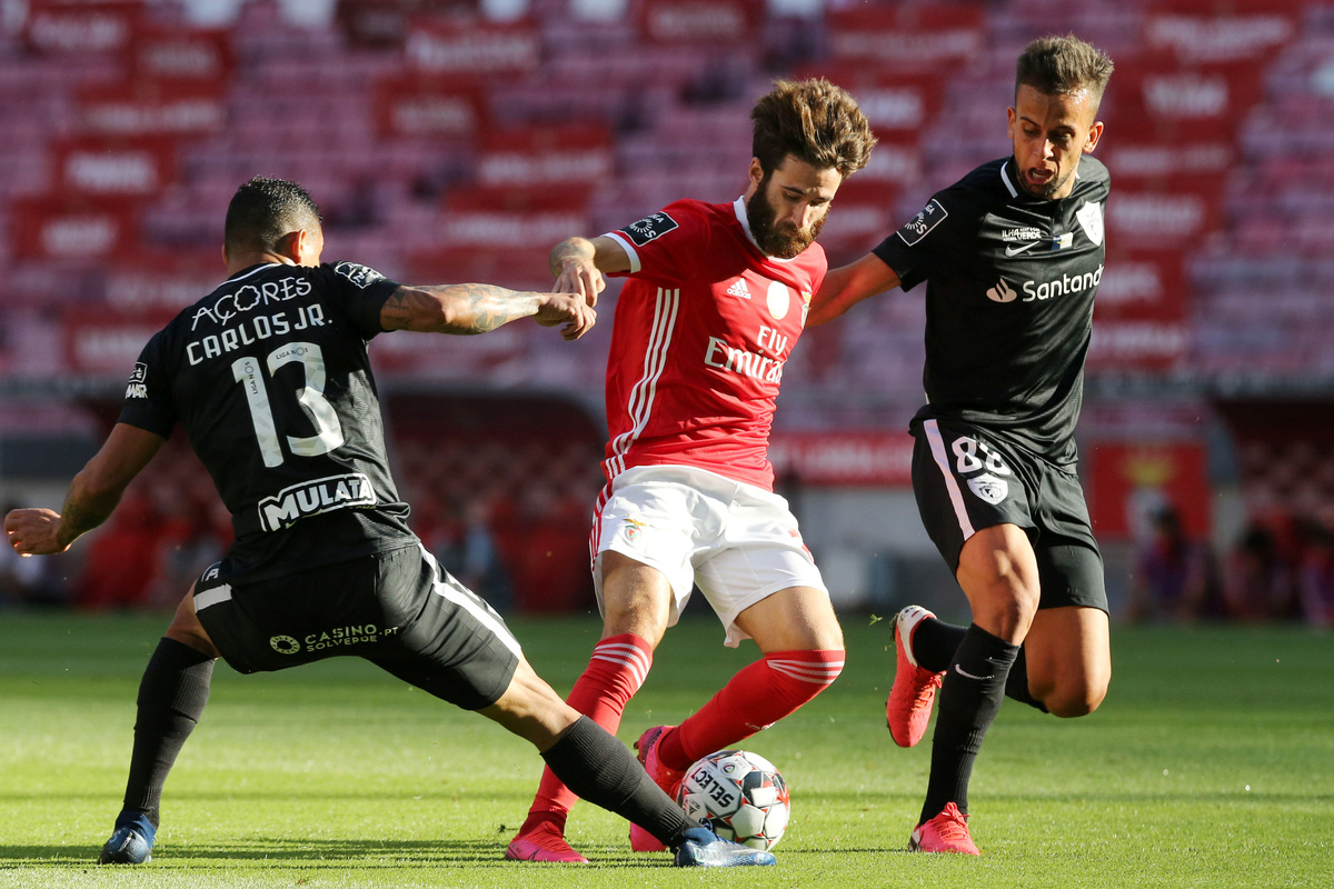 Soccer Football - Primeira Liga - Benfica v Santa Clara - Estadio da Luz, Lisbon, Portugal - June 23, 2020. Benfica's Rafa in action with Santa Clara's Carlos Junior and Franscisco Ramos, following the resumption of play behind closed doors after the outbreak of the coronavirus disease (COVID-19) Manuel De Almeida/Pool via REUTERS