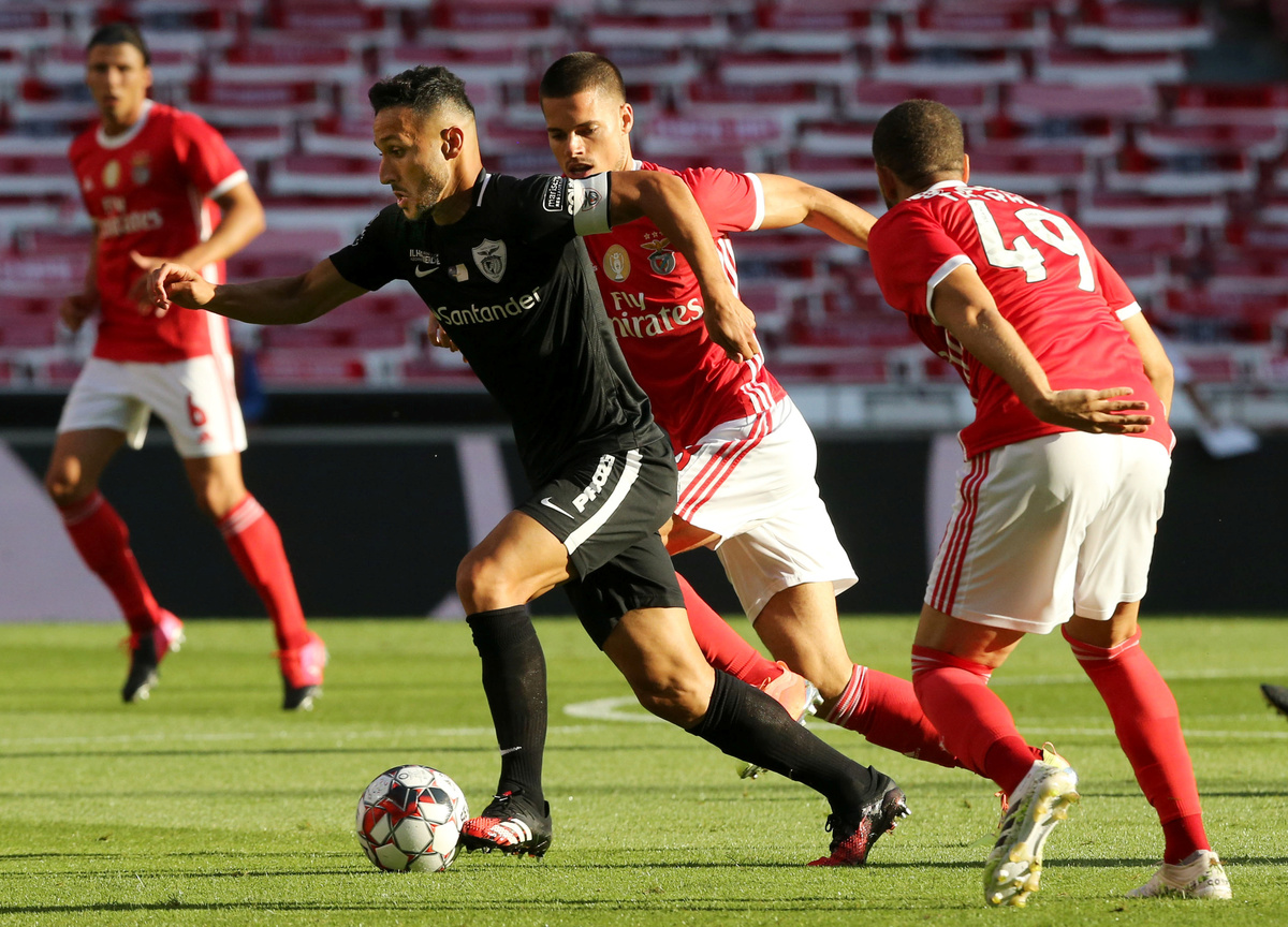 Soccer Football - Primeira Liga - Benfica v Santa Clara - Estadio da Luz, Lisbon, Portugal - June 23, 2020. Benfica's Rafa in action with Santa Clara's Carlos Junior, following the resumption of play behind closed doors after the outbreak of the coronavirus disease (COVID-19) Manuel De Almeida/Pool via REUTERS