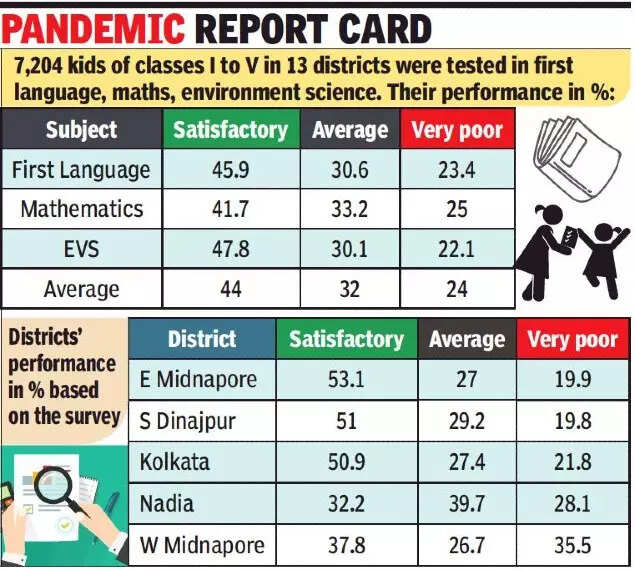 The level of learning seems to have taken the worst hit in West Midnapore, where 35.5% students fared poorly, followed by that in Nadia (28.1%) and Purulia (26.9%). Atudents in 13 districts, including Kolkata, were assessed. Kids in E Midnapore, S Dinajpur and Kolkata fared the best with over 50% performing satisfactorily.