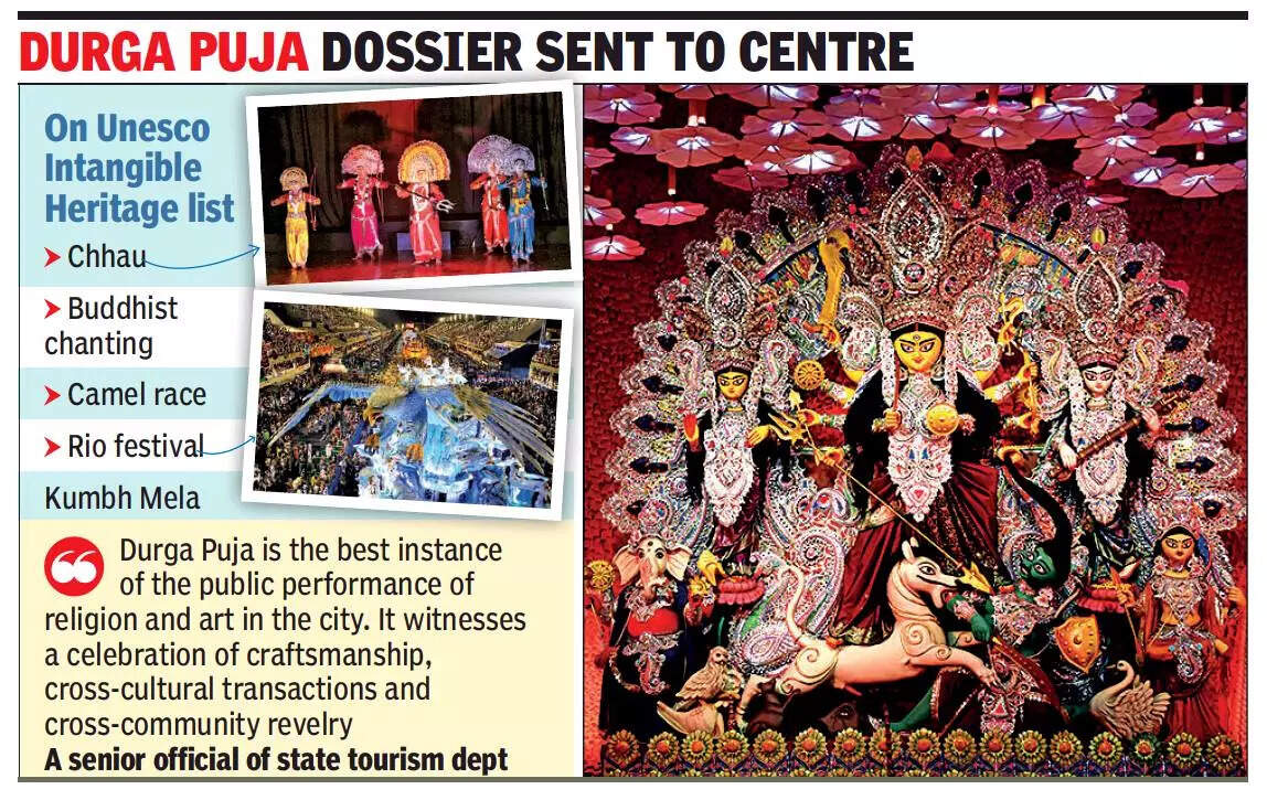 KOLKATA: The state has pitched Durga Puja, which is celebrated in several states in India and Bangladesh with its epicentre in Kolkata, for inclusion on Unesco’s Representative List of Intangible Cultural Heritage this year. The tourism department has forwarded the dossier to the central government, which will recommend it to Unesco as an entry from India.