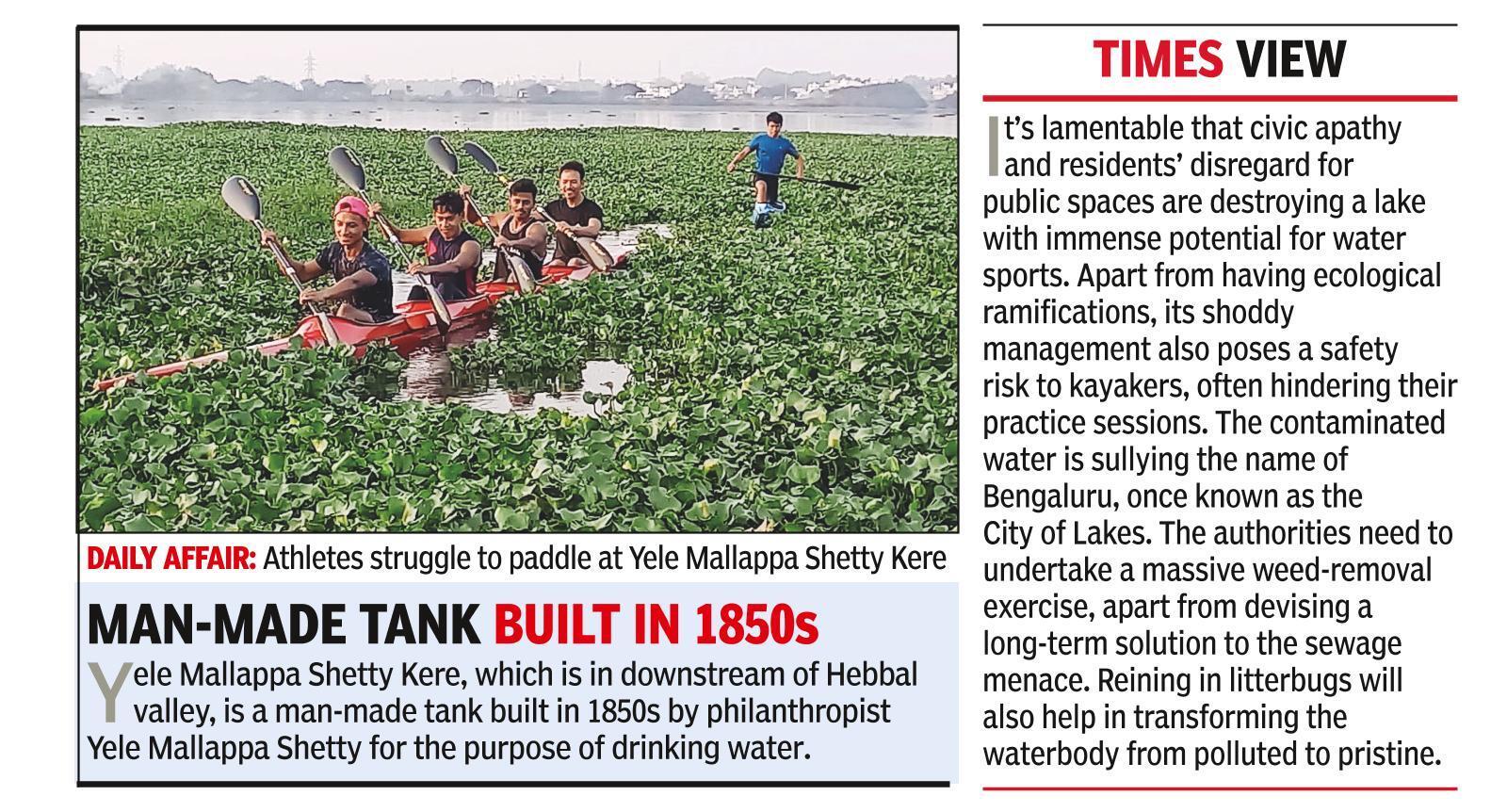 "It’s lamentable that civic apathy and residents’ disregard for public spaces are destroying a lake with immense potential for water sports. Apart from having ecological ramifications, its shoddy management also poses a safety risk to kayakers, often hindering their practice sessions. The contaminated water is sullying the name of Bengaluru, once known as the City of Lakes. The authorities need to undertake a massive weed-removal exercise, apart from devising a long-term solution to the sewage menace. Reining in litterbugs will also help in transforming the waterbody from polluted to pristine.-TimesView"