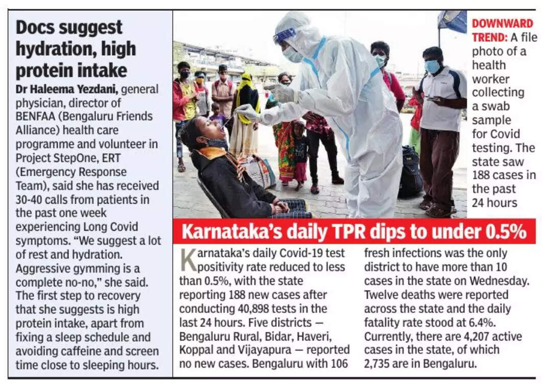 Dr Hirenappa Udnur, consultant-pulmonology and sleep medicine, Manipal Hospitals, Hebbal said the exact cause of Long Covid is unknown, but genetic factors and vaccination status could be among the many reasons for it. “Seeking early treatment is the key to avoiding Long Covid. Vaccination can also be used as a preventive tool,” Dr Udnur said, adding that as the number of Covid-19 infections is decreasing, the number of Long Covid cases is also reducing.