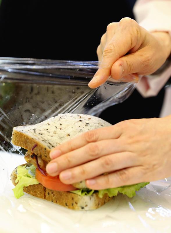 Too many ingredients can cause sandwiches to collapse. Sugiyama placed a sandwich on a piece of plastic wrap, then lifted the edges of the plastic and pulled it tight over the sandwich. She then lightly pushed down on the bread with both hands and left it for about 10 minutes.