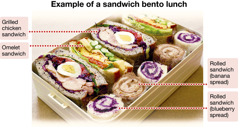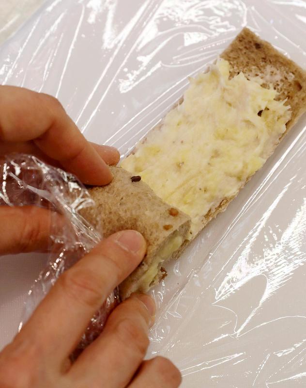 To make sandwich rolls, Sugiyama uses a homemade spread on two slices of bread that are placed vertically on plastic wrap and then rolled as if she was making sushi. The spread can be made by mixing mashed baked banana or blueberries with cream cheese.